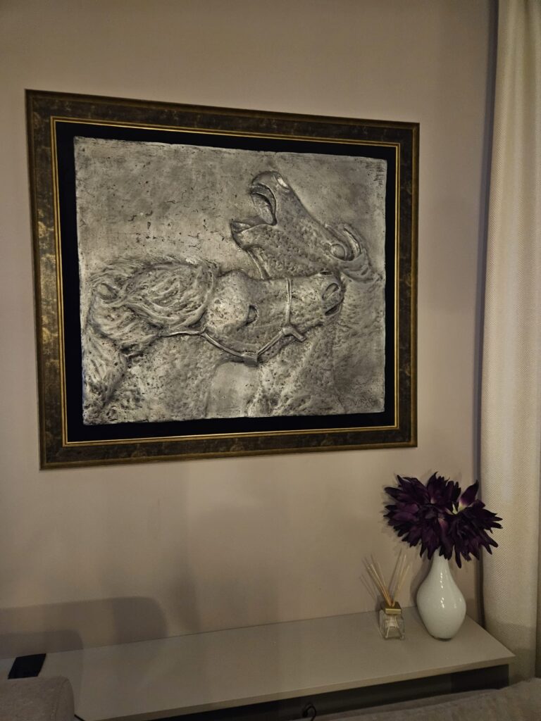 Motiv borbe konja u skulpturi snažno prenosi energiju, pokret i sirovu snagu prirode. Sukob dvaju snažnih tijela uhvaćen je u trenutku napetosti, gdje mišići, položaj i dinamika stvaraju osjećaj stalnog gibanja. Konj, kao simbol slobode i plemenitosti, u ovom kontekstu dobiva dodatnu dimenziju – postaje prikaz instinkta, dominacije i borbe za prevlast.