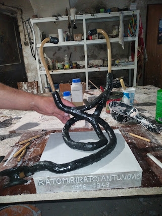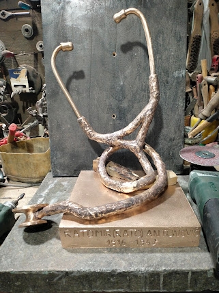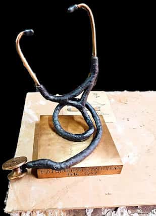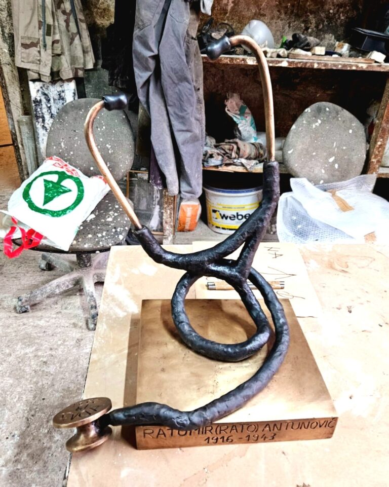 Skulptura „Stetoskop“ autora Ratomir Rato Antunović snažno povezuje umjetnost i medicinu, koristeći prepoznatljiv oblik instrumenta kao simbol brige, slušanja i razumijevanja. Stetoskop, kao produžetak liječničkog osjeta, ovdje nadilazi svoju funkcionalnu svrhu i postaje metafora dubljeg osluškivanja – ne samo tijela, već i društva i vremena u kojem živimo.